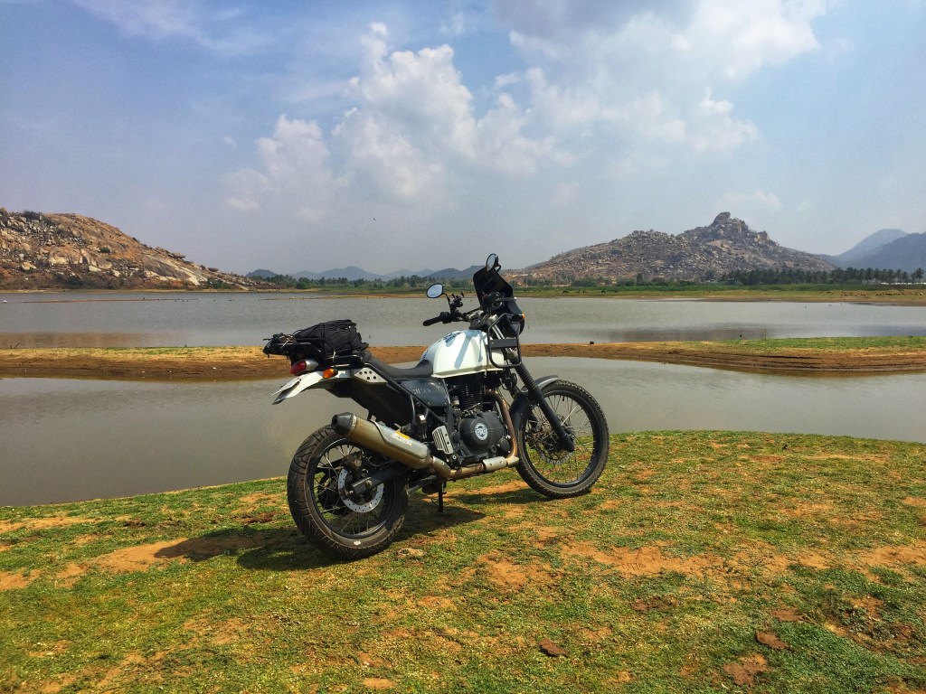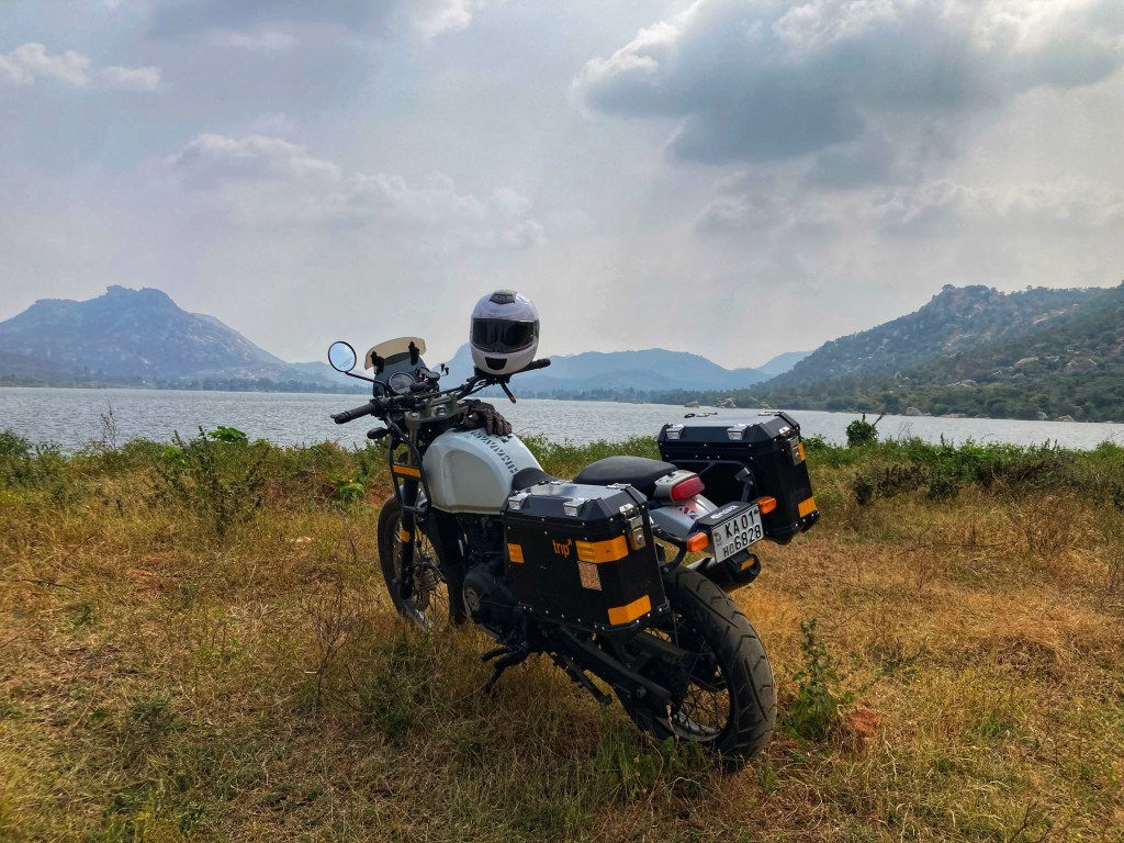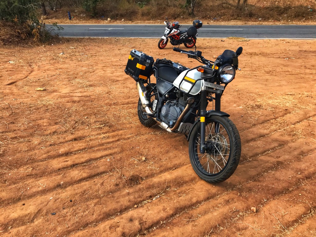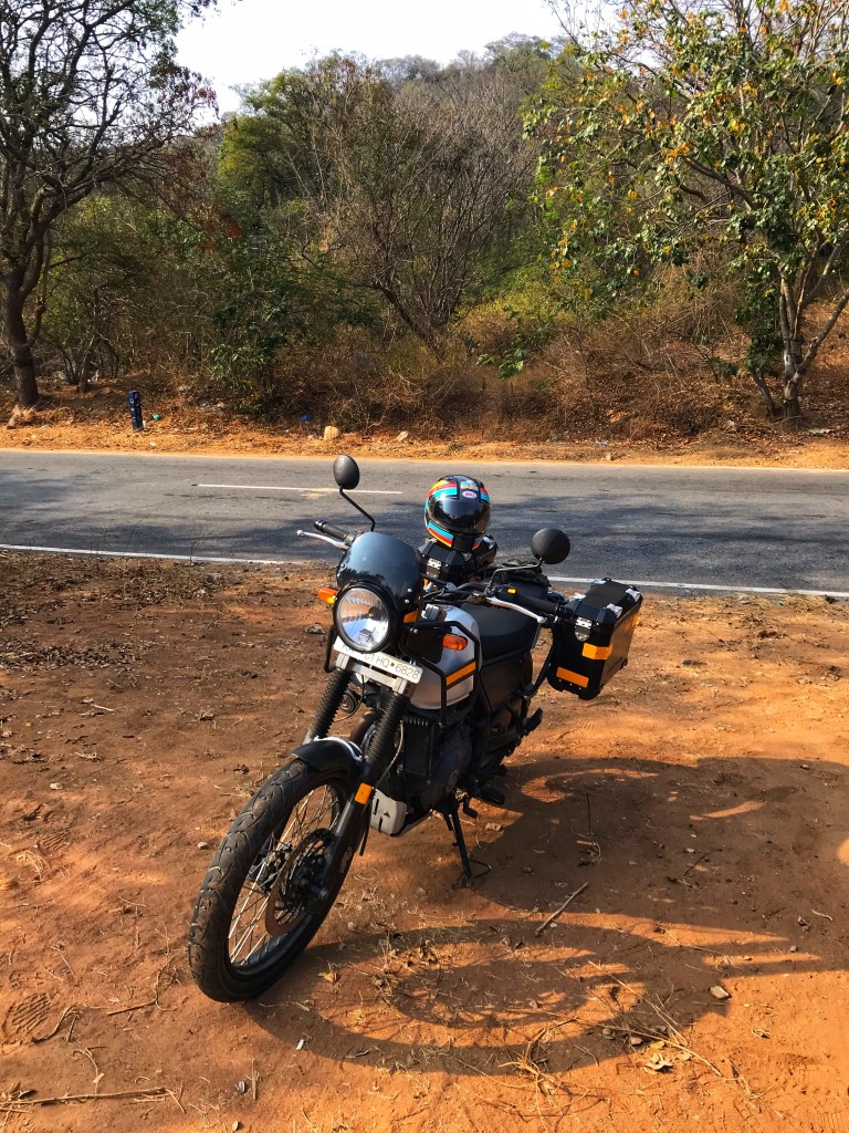 These two rides did point out some deficiencies, however. I had been making do with a bent handlebar on the Himalayan, ever since a fall on a ride, some months ago. The Mysore ride made it evident that the handlebar needed replacing-I could feel the strain on one of my shoulders. The stock mirrors also showed their inadequacy on the highway. A bit of online trolling revealed that many Himalayan owners had changed their mirrors- with the Royal Enfield GT stock mirrors being a favourite. When the time came round for the second service, these two updates were on top of my list. Here’s how the bike fares now, looks-wise,with its new handlebar and GT mirrors. Next on the agenda, perhaps the performance exhaust. 🙂 But before that, a ride.